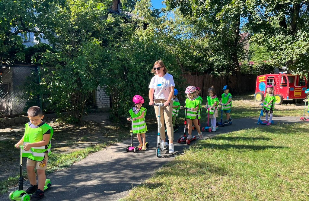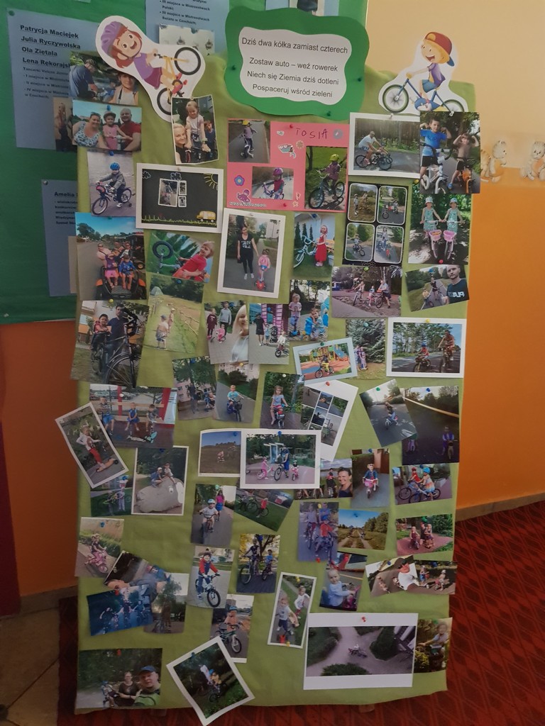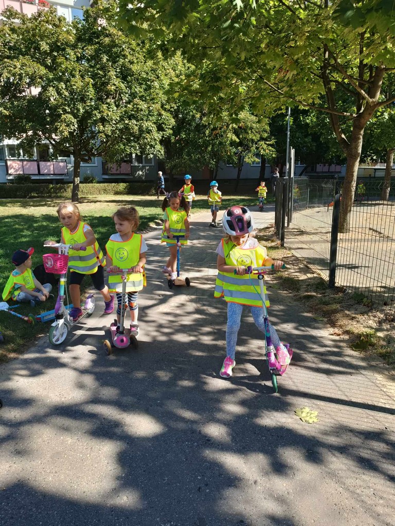 Przedszkolaki ze swoimi wychowawcami wybrały się na wycieczki na pobliskie skrzyżowania aby przypomnieć i utrwalić sobie zasady ruchu drogowego i bezpiecznego poruszania się po przejściach dla pieszych. Starszaki odwiedziły serwis rowerowy, zobaczyły na czym polega praca serwisanta, dowiedziały się,że prawie każdy rower można zreperować i nie trzeba go wyrzucać. W 21 września dzieci przyjechały do przedszkola hulajnogami i rowerami, była prezentacja własnych pojazdów, rozmowa na temat bezpiecznego poruszania się między innymi uczestnikami ruchu a potem dzieci ruszyły w trasę, młodsze po ogrodzie przedszkolnym a najstarsze na pobliską ścieżkę rowerową. W Tygodniu Mobilności odwiedził nas ratownik i policjant, odbyły warsztaty udzielania I pomocy oraz prezentacja zawodu policjanta. Przedszkolaki ze swoimi rodzicami wykonały pracę plastyczną do konkursu pt.:” Mój Eko- środek transportu”, powstała też foto wystawa prezentujące nasze przedszkolne fit rodziny podczas aktywności fizycznych. Celebracje Europejskiego Tygodnia Mobilności zakończyliśmy spotkaniem wszystkich grup, prezentacji wierszy i piosenek tematycznych związanych z ekotransportem.